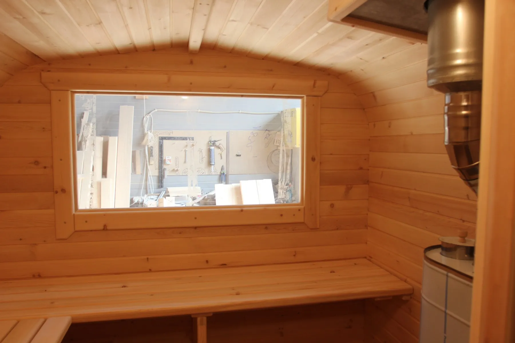 Это изделие круглой вытянутой формы с тремя отделениями: раздевалкой, моечной и парной. Во всех трех отделениях с обеих сторон установлены лавочки из кедра. Печь находится в парилке около дальней стены. Для удобства пользования в бане висят полочки из кедра и вешалка в раздевалке. Время растопки такой бани не превышает 30 минут. По вашему желанию баню-бочку можно дополнить печью с внешней загрузкой, благодаря которой весь мусор после топки останется на улице. Круглая баня-бочка не требует полноценный фундамент, поэтому при необходимости ее можно перенести в другое место.