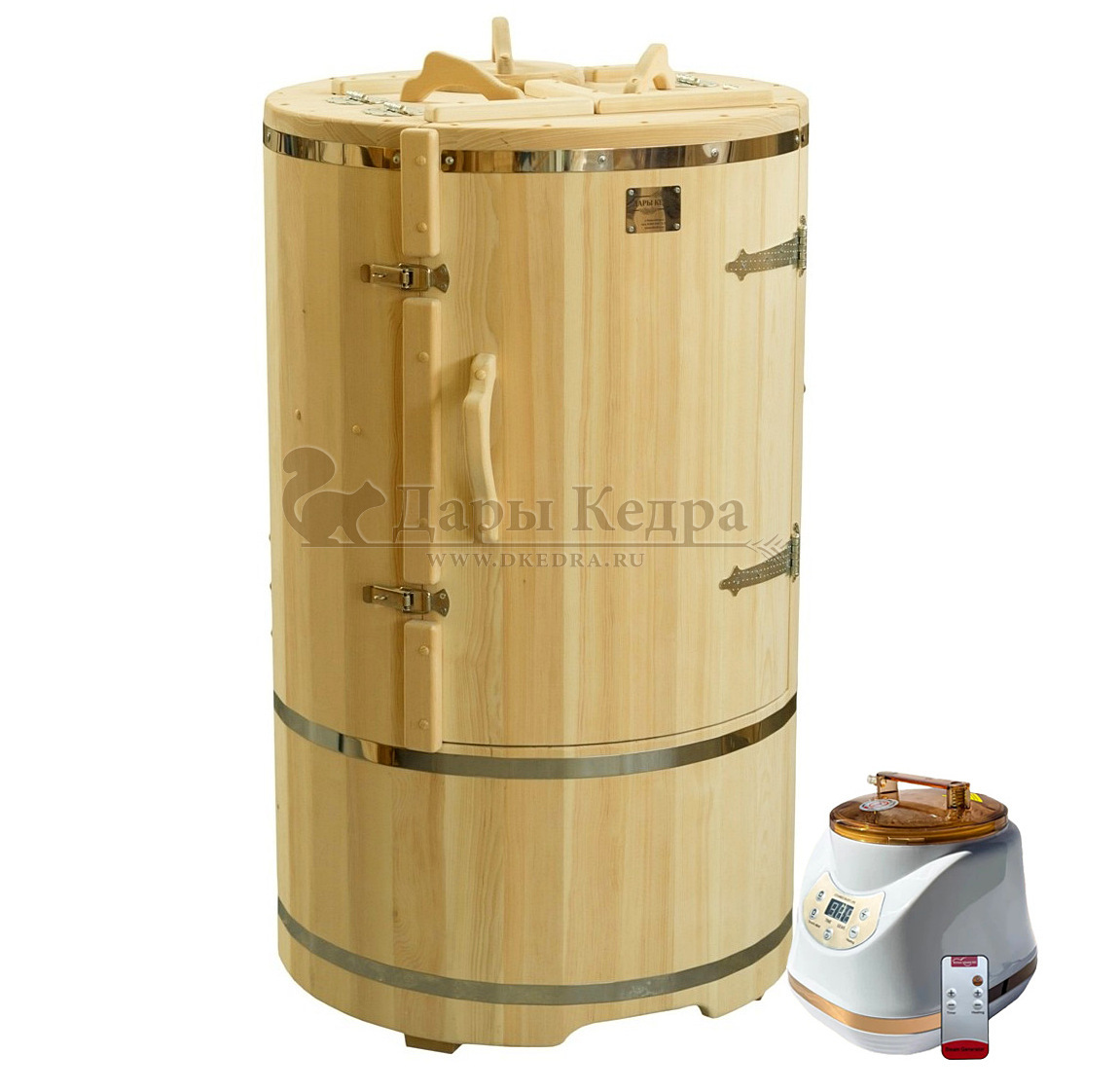 Кедровая бочка (фитобочка) круглая «Двухрежимная Профессиональная» Более продвинутая модель кедровой бочки (фитобочки). Компактное и в тоже время универсальное решение, совмещает в себе фитобочку и инфракрасную сауну. Благодаря толстым стенкам, данная модель отлично подойдет для частого домашнего или коммерческого использования. Пульт управления инфракрасной сауной и парогенератор премиум класса для кедровой бочки (фитобочки) идёт в комплекте, ничего дополнительно приобретать не нужно. Благодаря диаметру 900 мм, в этой бочке будет комфортно даже крупным людям. Купить кедровую бочку (фитобочку) круглой формы двухрежимную профессиональную Вы можете у нас на прямую по цене производителя.