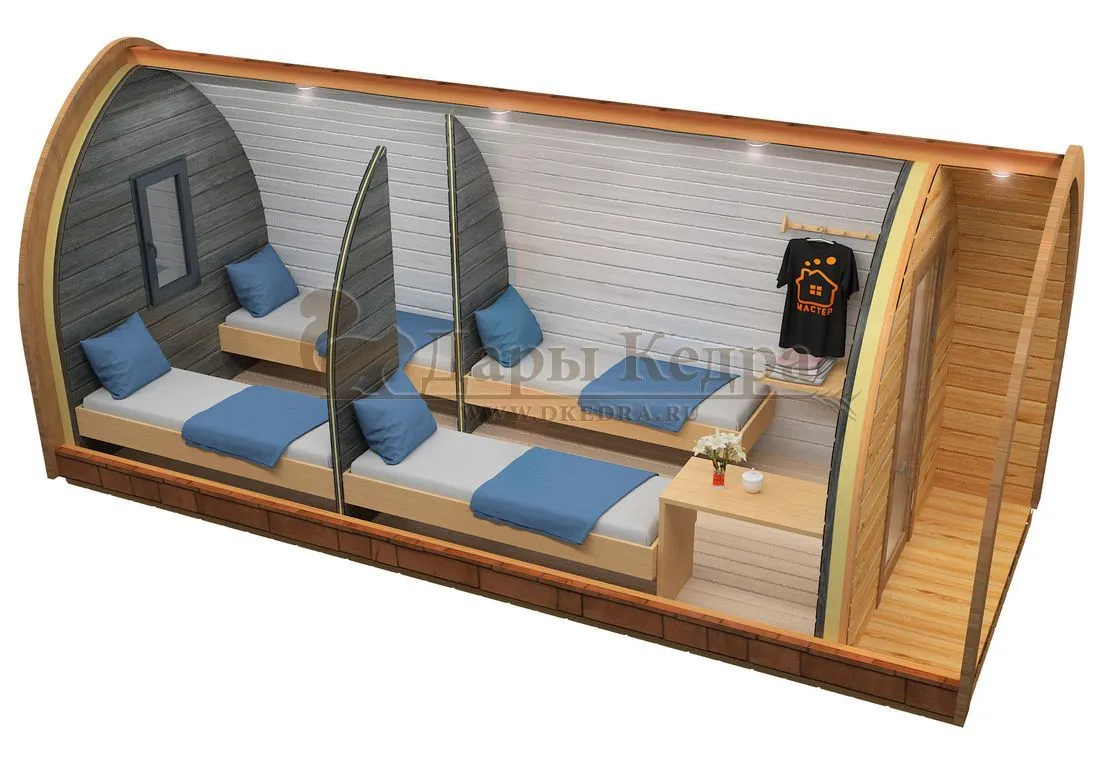 Такой кемпинг дом удобное и практичное решение для дачного использования или обустройства загородных баз отдыха. Изготовлен из хвойных пород древесины. Кровля из мягкой черепицы и цельный навес по всему фасаду изделия обеспечивают защиту от осадков. Домик включает в себя две спальные комнаты с четырьмя кроватями. По вашему желанию одно из помещений можно оборудовать под душевую зону с санузлом. Для удобства пользования в домике находится навесной столик, полка и вешалка. Входная дверь изготовлена из двойного стеклопакета.