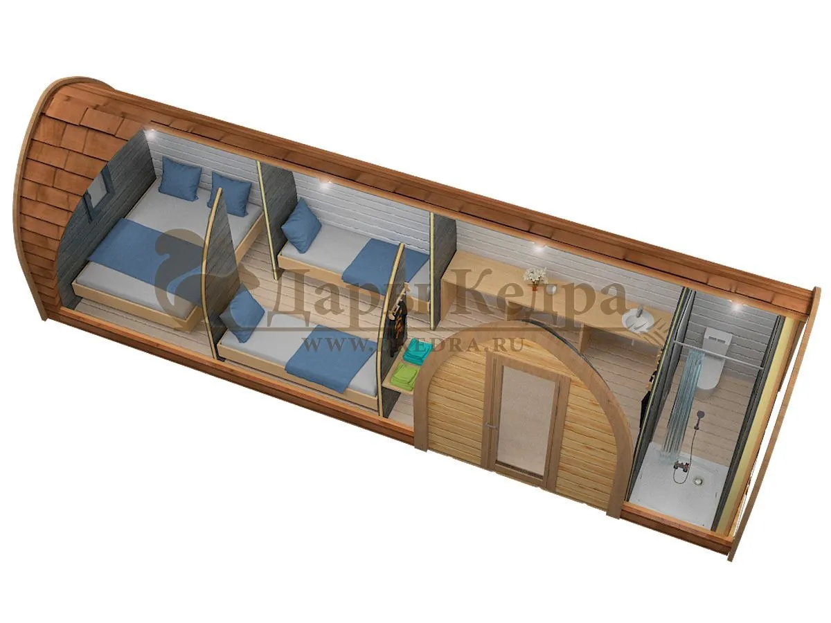 Кемпинг дом изготовлен из хвойных пород древесины. Кровля из мягкой черепицы обеспечивают защиту от осадков.