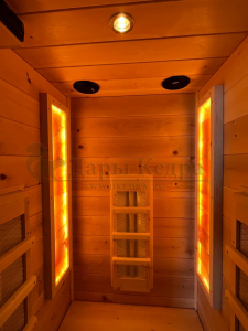 Это специально оборудованная кабина из липы для прогрева тела человека сухим теплом. Воздух в таких парных не нагревается. Инфракрасные лучи воздействуют на тело, равномерно прогревая мышцы, суставы и органы. Керамические излучатели похожи на лампы, имеют высокую температуру нагрева, поэтому защищены противоожоговыми решетками. Тело человека в таких саунах нагревается интенсивнее. Работает кабина за счет электричества. Компактная одноместная инфракрасная сауна с керамическими излучателями подойдет как для домашнего использования, так и для коммерции.