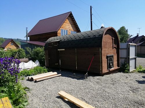 Всю зиму выбирали баню, смотрели сайты, цены сравнивали. Очень уж понравилась буханка. Необычная и вместительная. Мы еще попросили ее в цвет покрасить, получилась еще лучше. Встала на место у забора, очень удобно лишнее место не занимает и красиво смотрится. Паримся не нарадуемся, в такой красоте это двойное удовольствие! Спасибо компании, рекомендуем.